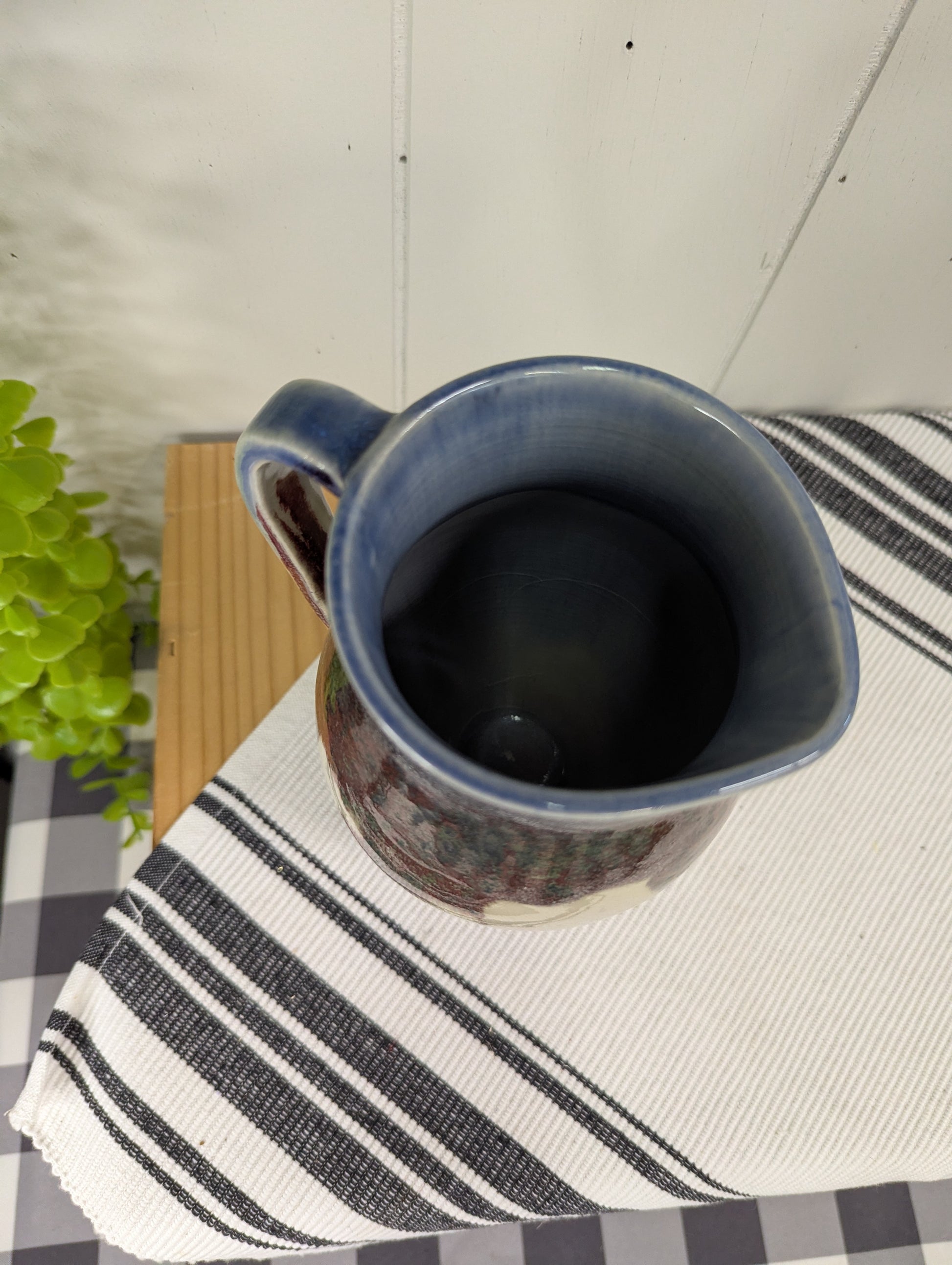 This isn't just a pitcher, it's a small ceramic masterpiece! With a drip glaze that looks like a beautiful abstract painting swirling around it, this earthenware beauty is ready to be the star of your kitchen or dining table. It's so pretty, you might just want to admire it more than what's inside. Artist signed E. Wilson 2001