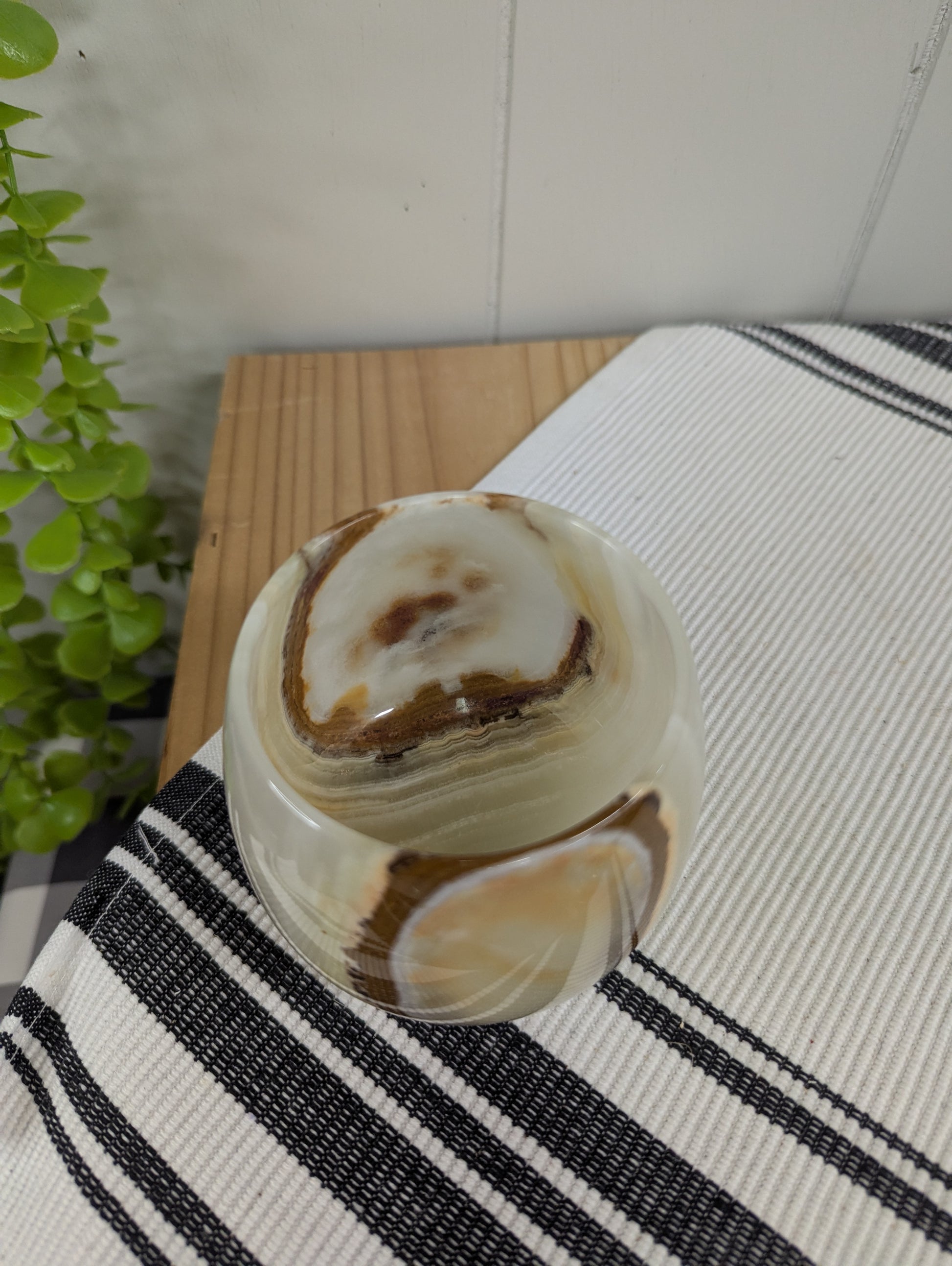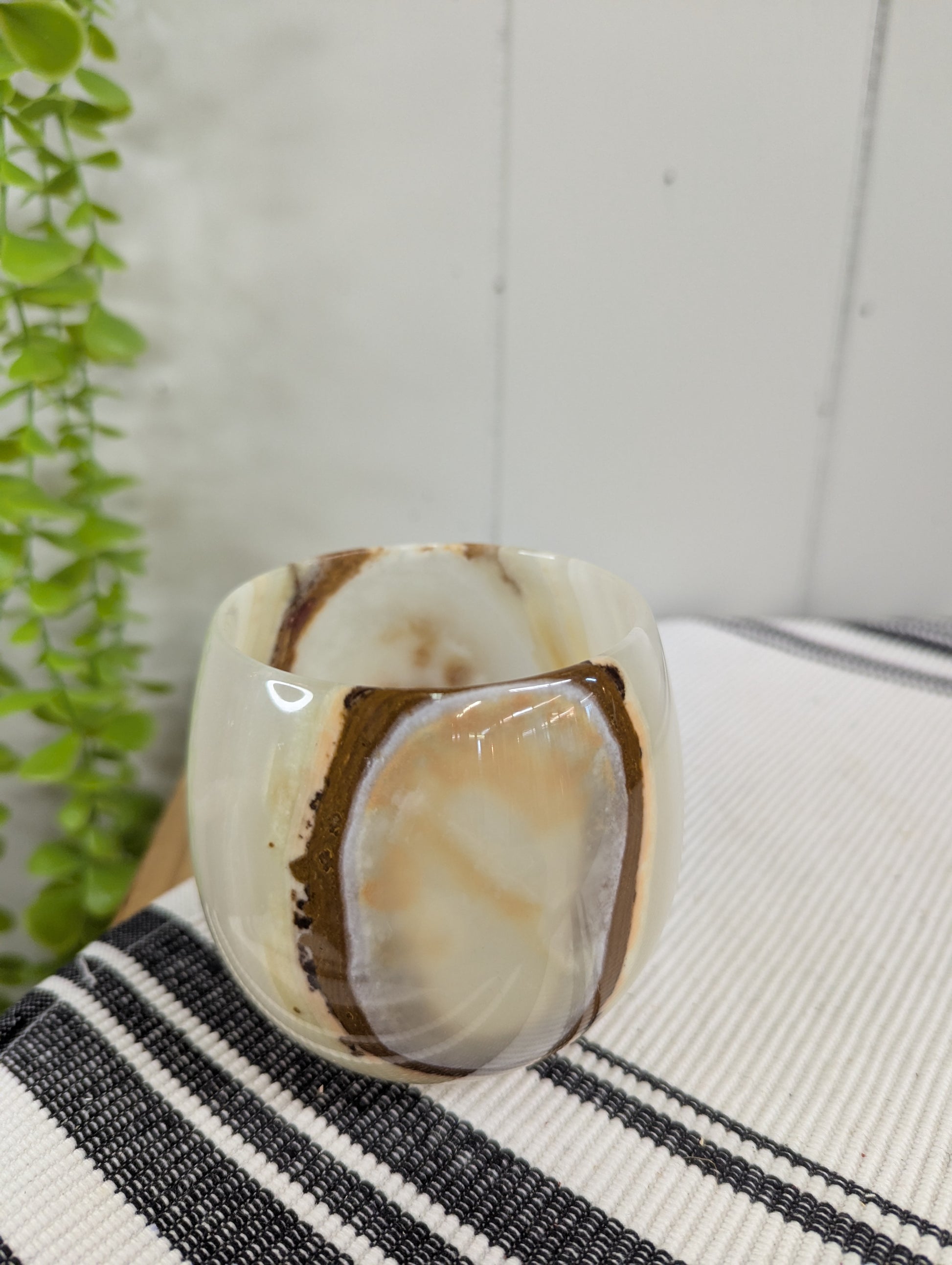 Behold! A piece that's both grounding and glowing. This gorgeous onyx stemless goblet isn't just a cup; it's a mini marvel of geological art! Whether you fill it with a comforting tea, a dash of something stronger, or let a tea light dance within its translucent walls, it promises to add a touch of natural magic to any space. Good vibes, guaranteed.