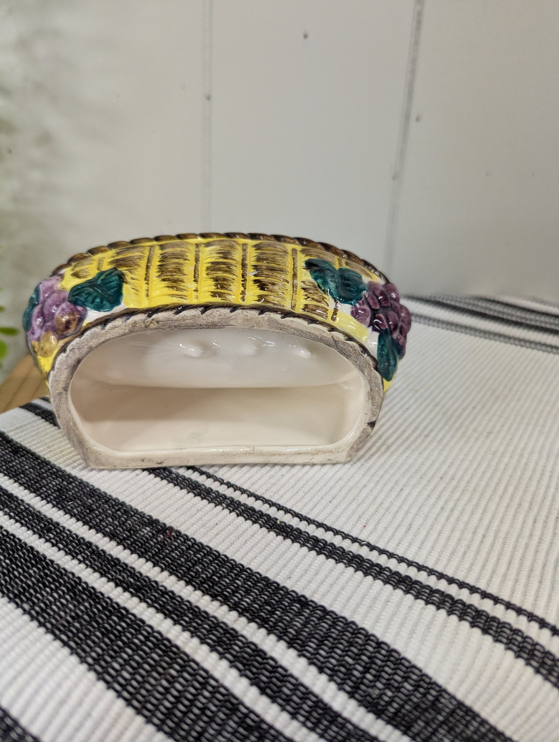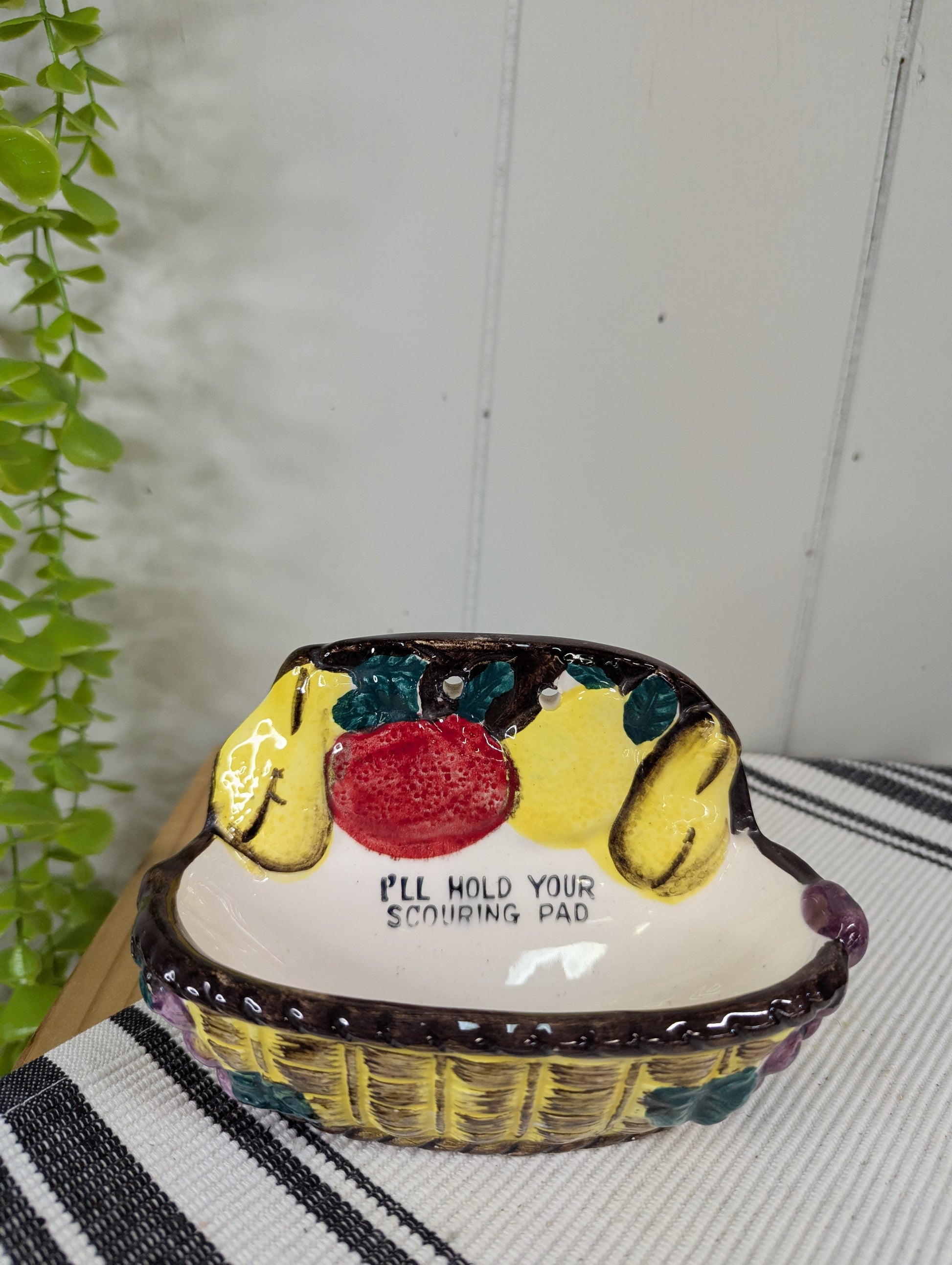 Finally, a kitchen helper who tells it like it is! 😉 This delightful vintage ceramic holder, complete with a charming fruit basket design, is here for one simple, yet crucial, task: to proudly declare "I'LL HOLD YOUR SCOURING PAD." No more soggy sponges or lost scrubbers. It's the honest, adorable little utility player your sink has been dreaming of!