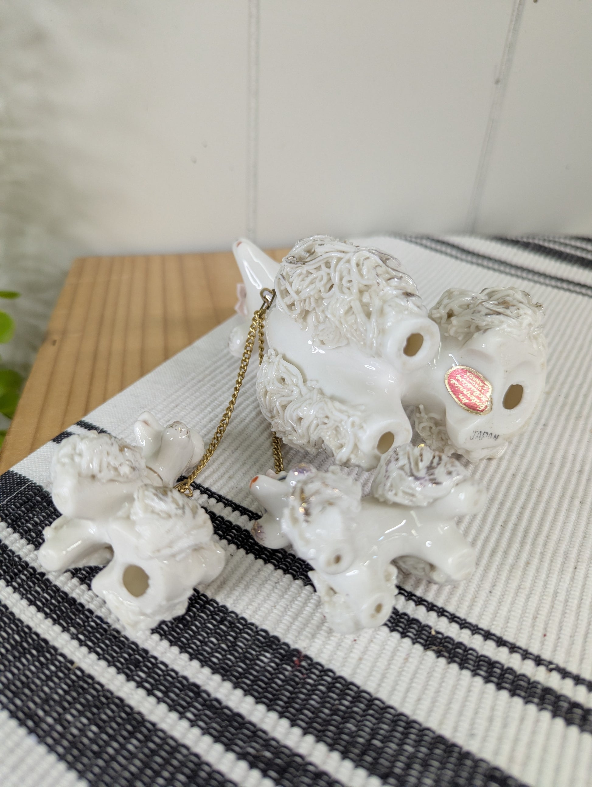 Forget your average ceramic canine – this isn't just a poodle, it's a spaghetti noodle poodle! With its whimsical, textured coat and those adorable blue eyes, this vintage figurine is ready to wag its way into your heart (and onto your shelf). It's the perfect conversation starter for anyone who appreciates unique decor and a good pasta pun. Just try not to get any actual spaghetti tangled in its fabulous fur!